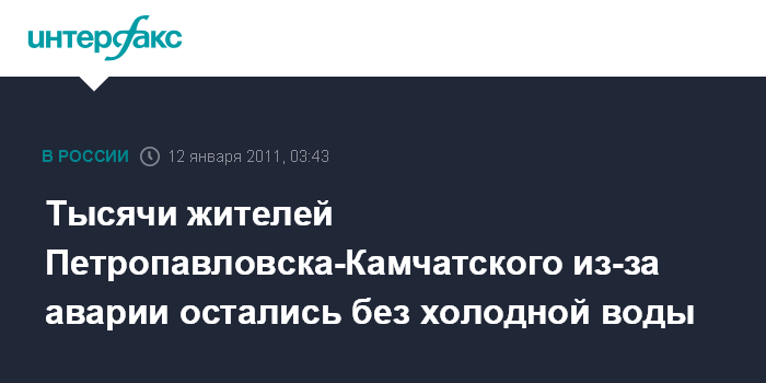 Петропавловск-Камчатский. 12 января. ИНТЕРФАКС-ДАЛЬНИЙ ВОСТОК - Крупная авария в системе холодного водоснабжения микрорайона Завойко в Петропавловске-Камчатском произошла в ночь на среду, сообщил агентству "Интерфакс - Дальний Восток" представитель МУП "Петропавловский Водоканал".
