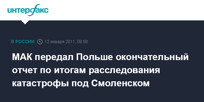 Москва. 12 января. INTERFAX.RU - Межгосударственный авиационный комитет (МАК) передал Польше окончательный отчет по результатам расследования катастрофы самолета президента Польши Леха Качиньского под Смоленском.