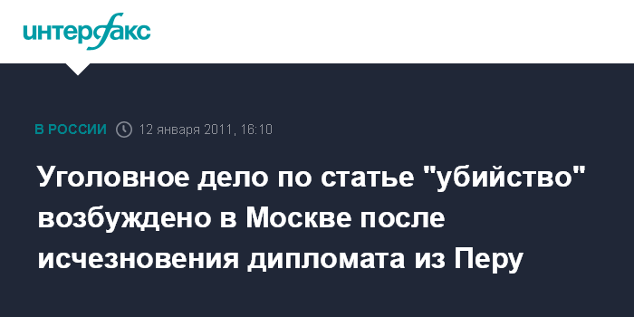 Москва. 12 января. INTERFAX.RU - Следственные органы возбудили уголовное дело по статье "убийство" в связи с исчезновением в Москве высокопоставленного сотрудника посольства Перу, сообщили "Интерфаксу" в Следственном комитете России в среду.