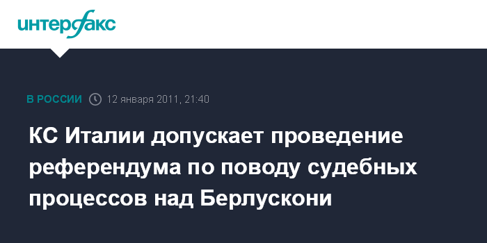 Рим. 12 января. INTERFAX.RU - Вопрос о том, можно ли привлекать к суду председателя Совета министров Италии Сильвио Берлускони, не дожидаясь его ухода с этого поста, можно вынести на общенациональный референдум, объявили в среду в конституционном суде Италии.