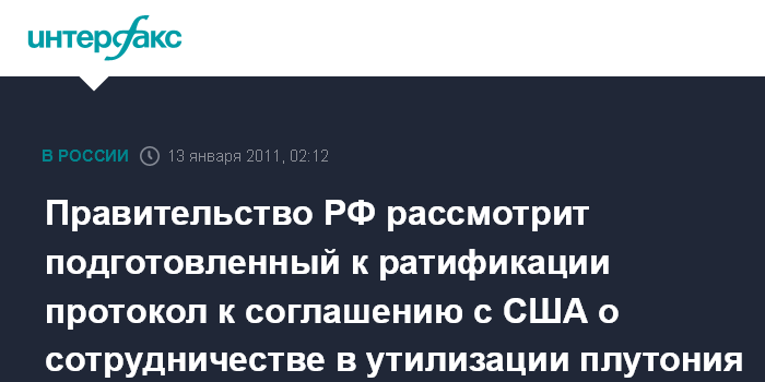 Правительство РФ рассмотрит подготовленный к ратификации протокол к соглашению с США о сотрудничестве в утилизации плутония