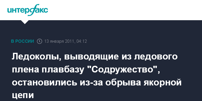 Южно-Сахалинск. 13 января. ИНТЕРФАКС-ДАЛЬНИЙ ВОСТОК - Конвой из двух ледоколов "Адмирал Макаров" и "Красин", выводящий изо льдов Сахалинского залива плавбазу "Содружество", минувшей ночью остановился из-за обрыва якорной цепи плавбазы, с помощью которой "Красин" тащит это судно на буксире.