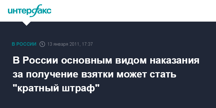 Москва. 13 января. INTERFAX.RU - Поправки в законодательство о противодействии коррупции, подготовленные соответствующим президентским советом, предусматривают введение ряда новелл в действующий Уголовный кодекс, в частности, предполагают введение в качестве основного наказания за получение взятки так называемый "кратный штраф",сообщила помощник-руководитель Главного правового управления президента РФ Лариса Брычева.