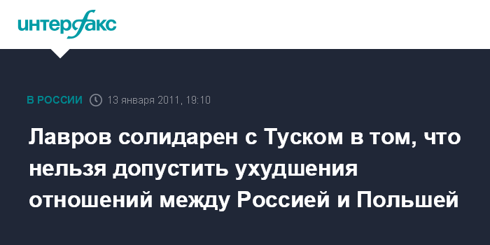Москва. 13 января. INTERFAX.RU - Глава МИД РФ Сергей Лавров согласился с премьер-министром Польши Дональдом Туском в том, что Москва и Варшава не должны допустить ухудшения двусторонних отношений.