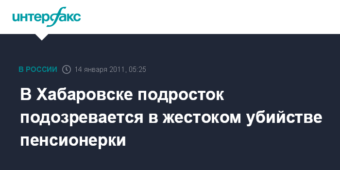 Хабаровск. 14 января. ИНТЕРФАКС-ДАЛЬНИЙ ВОСТОК - Следственный комитет по Хабаровскому краю возбудил уголовное дело в отношении 17-летнего подростка, подозреваемый в убийстве пожилой женщины, у которой накануне взял в долг 5 тыс. рублей.
