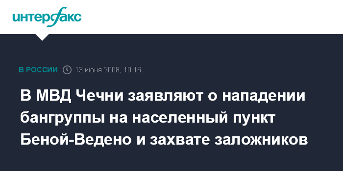 Грозный. 13 июня. ИНТЕРФАКС - В населенный пункт Беной-Ведено Ножай-Юртовского района Чечни вошла вооруженная бандгруппа, численность которой устанавливается, сообщили "Интерфаксу" в дежурной части МВД Чечни.