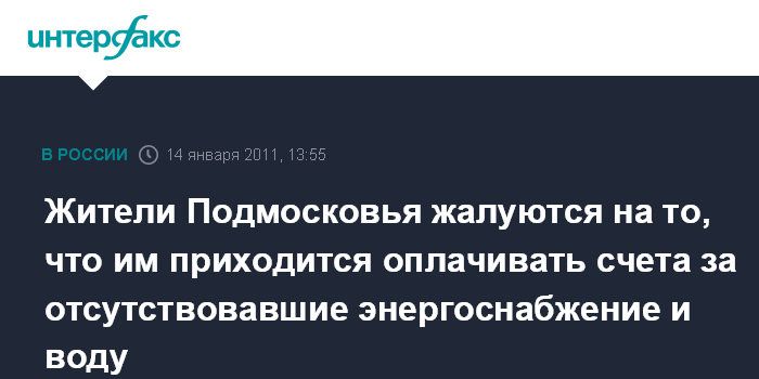 Москва. 14 января. INTERFAX.RU – Жители населенных пунктов Подмосковья, оставшиеся без энергоснабжения в конце декабря 2010 г., жалуются на то, что в пришедших им квитанциях на оплату декабрьских расходов на воду и тепло не учтены дни, которые они провели в темноте и холоде.