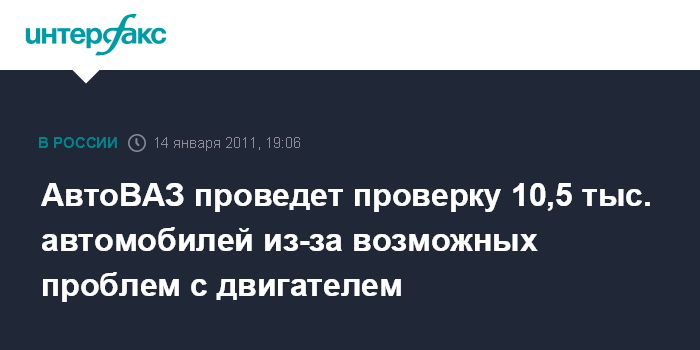 Москва/Самара. 14 января. INTERFAX.RU - ОАО "АвтоВАЗ" (РТС: AVAZ) проведет проверку 10,5 тыс. автомобилей Lada Kalina, Lada Priora, Lada Samara, Lada 2105/2107 и Lada 4x4 из-за возможных проблем в работе двигателя.