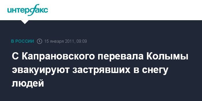 Магадан. 15 января. ИНТЕРФАКС - ДАЛЬНИЙ ВОСТОК - С Капрановского перевала в Омсукчанском районе Колымы, где в снежной блокаде на дороге более 20 человек ждут помощи с 12 января, началась эвакуация.