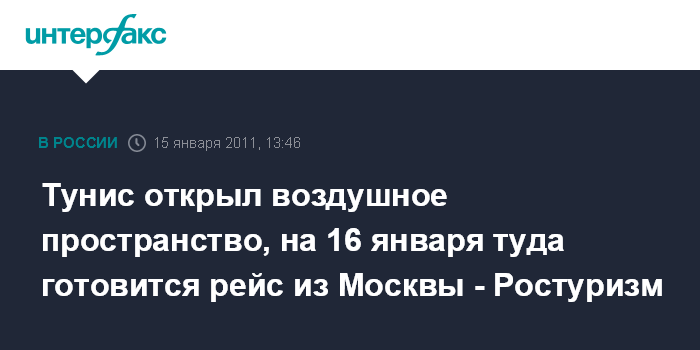 Москва. 15 января. INTERFAX.RU - Информация об открытии воздушного пространства над Тунисом имеется, рейс "Трансаэро" за российскими туристами вылетит завтра по расписанию, сообщил агентству заместитель руководителя Федерального агентства по туризму (Ростуризм) Александр Радьков. По его словам, если ситуация не ухудшится, рейс состоится завтра по расписанию. "В ближайшее время мы опубликуем на сайте точную информацию об этом рейсе, чтобы туроператоры смогли проинформировать своих туристов. Самолет будет не Боинг-747-400, который вмещает 140 человек, а другой, большей вместимости", - сказал А.Радьков.