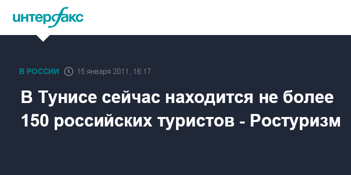 Москва. 15 января. INTERFAX.RU - По уточненным данным, на всех курортах в Тунисе сейчас находится не более 150 российских туристов, сообщил агентству пресс-секретарь Федерального агентства по туризму (Ростуризм) Олег Мосеев. По его словам, данные о количестве российских туристов уточнялись с помощью туроператоров, а также принимающих тунисских компаний. "В итоге мы можем сказать, что, по данным на середину дня субботы, на всех курортах Туниса находится не более 150 россиян, а не 250, как сообщалось ранее", - сказал О.Мосеев "Интерфаксу".