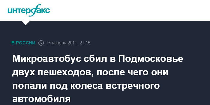 Москва. 15 января. ИНТЕРФАКС - На северо-западе Московской области микроавтобус сбил насмерть двух пешеходов, сообщил "Интерфаксу" источник в правоохранительных органах в субботу.