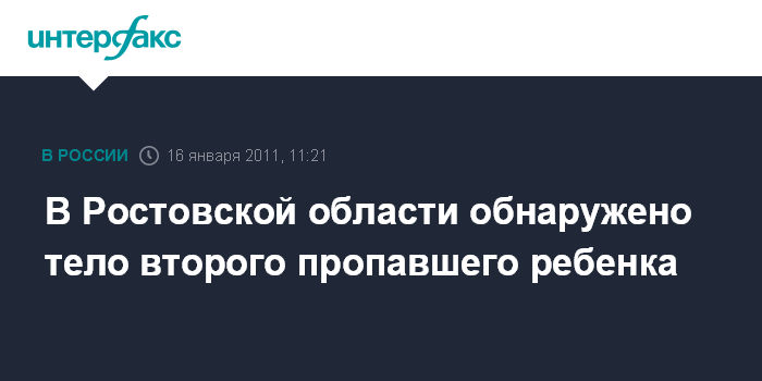 Ростов-на-Дону. 16 января. INTERFAX.RU - Обнаружено тело второго ребенка из числа пропавших в Ростовской области, сообщают в Следственном управлении СК по региону. "Тело мальчика извлекли на поверхность недалеко от места, где утонула девочка", - сказала в воскресенье агентству "Интерфакс-Юг" официальный представитель СУ СК РФ по Ростовской области.