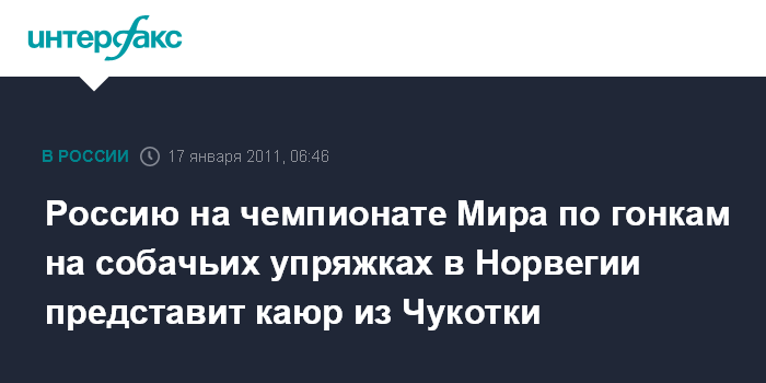 Представитель пресс-служба управления информационной политики Чукотского автономного округа (ЧАО) в понедельник сообщил агентству "Интерфакс - Дальний Восток", что чукотский каюр прибыл в город Рорус (Норвегия) по приглашению Международной федерации ездового спорта.