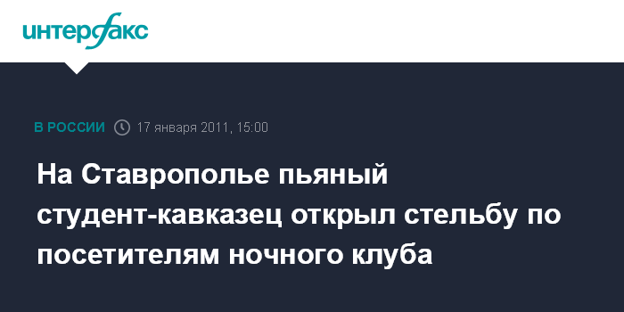 Ставрополь. 17 января. INTERFAX.RU - В городе Георгиевске (Ставропольский край) 19-летний студент из одной из республик Северного Кавказа в состоянии алкогольного опьянения открыл стрельбу из травматического пистолета, есть пострадавшие.