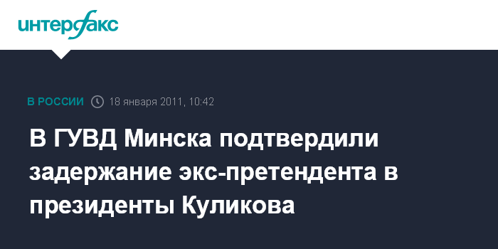 Минск. 18 января. INTERFAX.RU- В минской милиции официально подтвердили информацию о задержании бывшего претендента на пост президента Белоруссии Ивана Куликова.