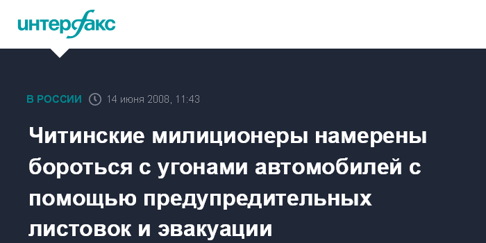 Как сообщает пресс-служба УВД по Забайкальскому краю, к оставленным без присмотра автомобилям милиционеры начнут прикреплять листовки, предупреждающие владельцев о том, что они могут стать жертвой угонщиков.