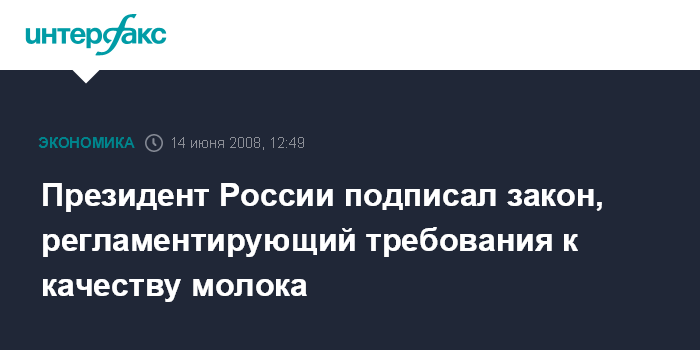 Москва. 14 июня. ИНТЕРФАКС - Президент России Дмитрий Медведев подписал Федеральный закон "Технический регламент на молоко и молочную продукцию", сообщает в субботу пресс-служба Кремля.