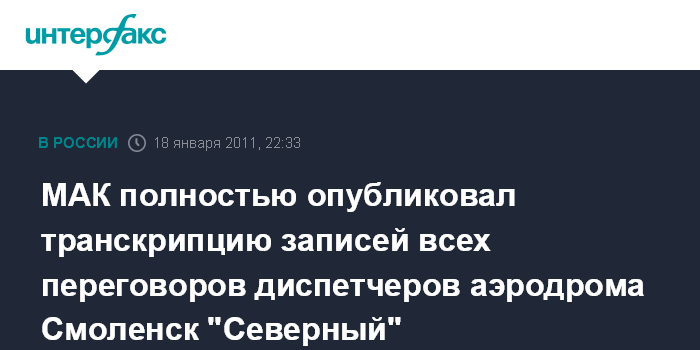 "В связи с появившимися в СМИ, со ссылкой на министра внутренних дел и администрации Республики Польша Ежи Миллера, сообщениями об опубликовании польской стороной записей разговоров диспетчеров аэродрома Смоленск "Северный", и с целью объективного информирования мировой общественности, с разрешения органов, проводящих предварительное следствие, в соответствии с приложением 13 к Конвенции о международной гражданской авиации, принято решение опубликовать полностью транскрипцию записей всех переговоров и разговоров, зарегистрированных диспетчерскими магнитофонами", - говорится в заявлении председателя Технической комиссии Межгосударственного авиационного комитета Алексея Морозова, которое опубликовано на сайте МАК.