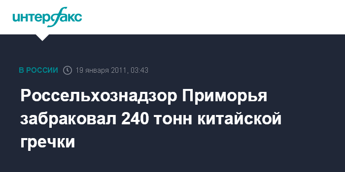 Владивосток. 19 января. ИНТЕРФАКС-ДАЛЬНИЙ ВОСТОК - Управление Федеральной службы по ветеринарному и фитосанитарному надзору (Россельхознадзор) по Приморскому краю запретило ввоз в Россию 240 тонн гречки из Китая.