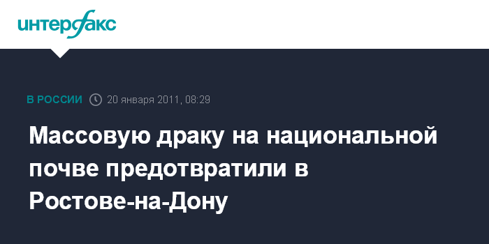 Ростов-на-Дону. 20 января. INTERFAX.RU - Конфликт между молодыми людьми различных национальностей, который мог вылиться в драку, предотвращен в Ростове-на-Дону, задержано около 12 человек.