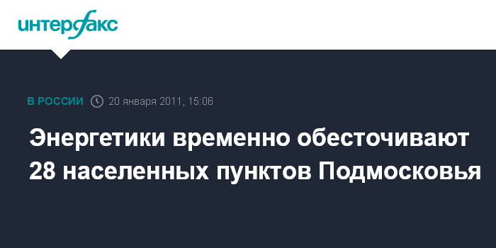 Москва. 20 января. INTERFAX.RU - Специалисты ОАО "Московская объединенная электросетевая компания" (МОЭСК) в четверг в рамках восстановления надежного электроснабжения Московской области планово отключают электроснабжение в 28 населенных пунктах.