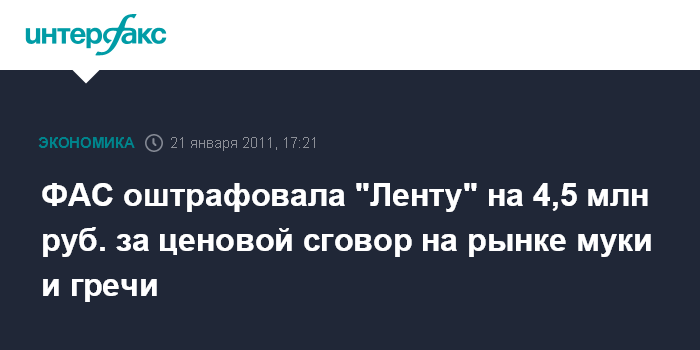Санкт-Петербург. 21 января. INTERFAX.RU - Петербургское управление ФАС РФ привлекло к административной ответственности торговую сеть "Лента" за согласованные действия с другими участниками рынка и установление завышенных цен на пшеничную муку и гречневую крупу.