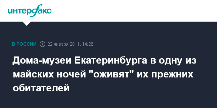 Екатеринбург. 22 января. INTERFAX.RU - Посетители ряда домов-музеев Екатеринбурга впервые увидят реконструкцию событий жизни их обитателей в "Ночь музеев", которая пройдет в середине мая, сообщила пресс-служба администрации города. В частности, такие программы предложат музеи Павла Бажова, Дмитрия Мамина-Сибиряка, Дом генерала Качки и другие "именных" музеях. "Такой интерактивный игровой момент зрители воспринимают с большим интересом. Это реконструкция времени и событий, когда в живом интерьере происходят события с участием живших там людей. Фактически мы предлагаем ожившее время", - пояснила начальник городского управления культуры Татьяна Ярошевская.