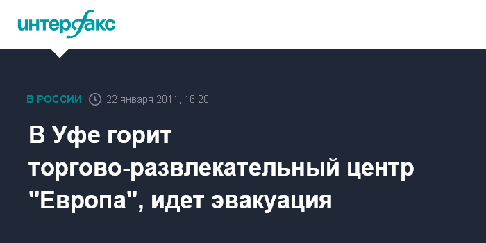 Москва. 22 января. INTERFAX.RU - В центре Уфы горит крупный торгово-развлекательный центр. "На проспекте Октября в торгово-развлекательном центре пожар, горят второй и третий этажи", - сообщил "Интерфаксу" руководитель Приволжского регионального центра МЧС России Олег Зугеев. Отвечая на вопрос о том, был ли взрыв в здании, он сказал: "Информации про взрыв у нас нет". Пожару присвоен третий номер сложности по пятибалльной шкале. На место пожара выехали 20 единиц пожарно-спасательной техники и 60 человек личного состава. Из горящего здания идет эвакуация.