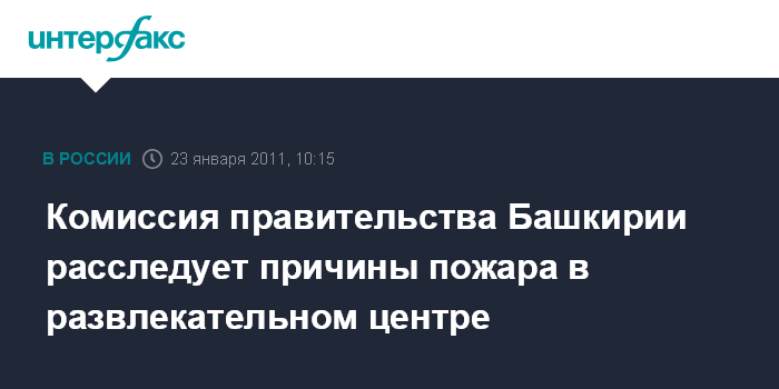 Уфа. 23 января. INTERFAX.RU - В Башкирии по распоряжению президента республики Рустэма Хамитова создана правительственная комиссия по расследованию причин пожара развлекательного центра "Европа" в Уфе, в результате которого погибли два человека. Как сообщил агентству "Интерфакс-Поволжье" пресс-секретарь президента Башкирии Артем Валиев в воскресенье, в правительственную комиссию по расследованию причин пожара вошли представители администрации главы региона, республиканских правительства, Минздрава, МВД и Ростехнадзора.