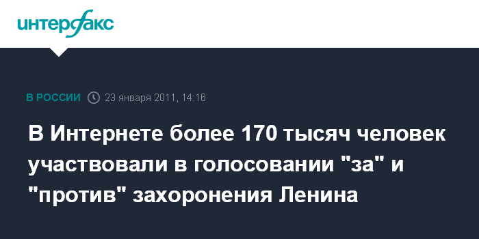 Москва. 23 января. INTERFAX.RU - Большинство проголосовавших в Интернете на сайте с эмблемой "Единой России" пользователей высказываются за захоронение тела Ленина. По данным на 13:50 мск, в голосовании приняли участие 177 тыс. 232 человека, из них 70% высказались за захоронение Ленина.