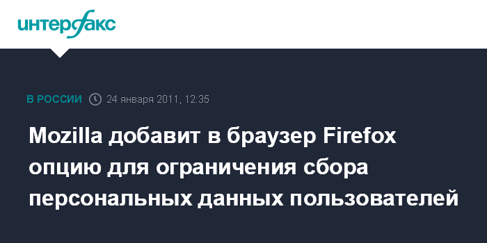 Нью-Йорк. 24 января. INTERFAX.RU - Mozilla Corp. планирует добавить в свой интернет-браузер Firefox специальную опцию, которая позволит пользователям ограничить сбор сайтами персональных данных о них, которые обычно используются в рекламных целях, пишет газета The Wall Street Journal.