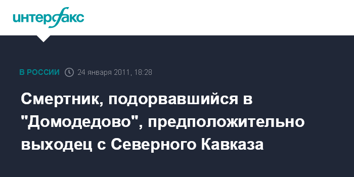 Москва. 24 января. INTERFAX.RU - Террорист-смертник, который привел в действие взрывное устройство в аэропорту "Домодедово", предположительно является выходцем с Северного Кавказа, сообщил "Интерфаксу" источник в правоохранительных органах на месте происшествия.
