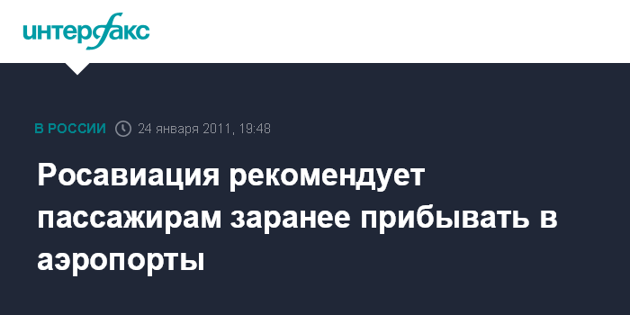 Москва. 24 января. INTERFAX.RU - Росавиация рекомендует пассажирам заранее прибывать в аэропорты в связи с тем, что увеличится время на досмотр пассажиров и багажа, сообщили "Интерфаксу" в Росавиации.