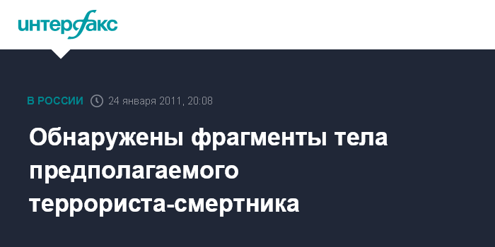 Москва. 24 января. INTERFAX.RU - На месте взрыва в аэропорту "Домодедово" обнаружены фрагменты тела предполагаемого террориста, сообщил "Интерфаксу" источник в правоохранительных органах на месте происшествия.