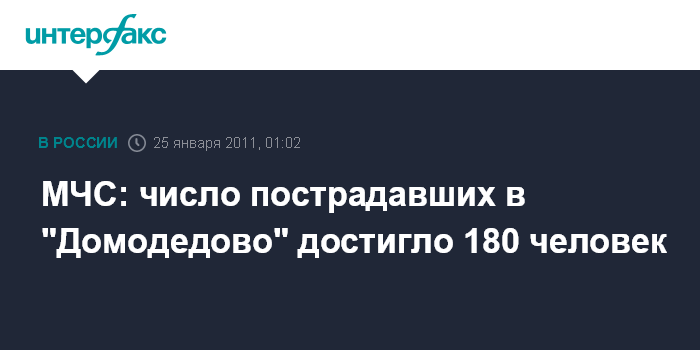Москва. 21 января. ИНТЕРФАКС - В результате теракта в "Домодедово" пострадали 180 человек, отмечается в сообщении, размещенном во вторник на сайте МЧС России.