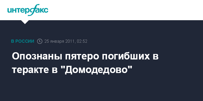 Москва. 25 января. ИНТЕРФАКС - Специалистами опознаны пять тел погибших в результате теракта в аэропорте "Домодедово", заявил в прямом эфире телеканала "Россия 24" представитель Московского центра судебно-медицинской экспертизы (ЦСМЭ).