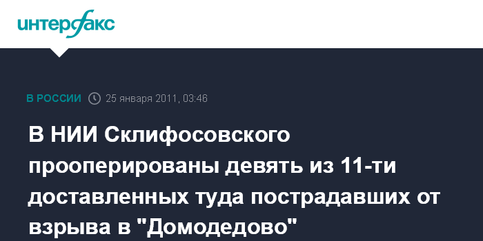 Москва. 25 января. ИНТЕРФАКС - Девять человек из числа пострадавших в результате теракта в "Домодедово" прооперированы в НИИ Скорой помощи им. Н.В. Склифосовского, заявил в прямом эфире телеканала "Россия-24" заместитель руководителя института Михаил Рогаль.