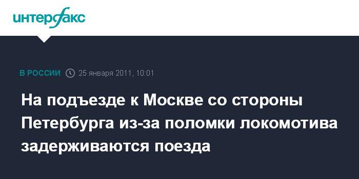 Москва. 25 января. INTERFAX.RU - Поломка локомотива на магистрали Октябрьской железной дороги в районе подмосковной станции Крюково стала причиной задержки нескольких поездов и электричек.