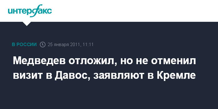 Москва. 25 января. INTERFAX.RU - Поездка президента РФ Дмитрия Медведева на Всемирный экономический форум в Давосе отложена, но не отменена, уточняют в Кремле.