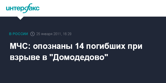 Москва. 25 января. INTERFAX.RU - Четырнадцать жертв теракта в "Домодедово" уже опознаны, заявляют в МЧС России.