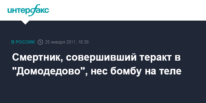 Москва.25 января. INTERFAX.RU - Взрывное устройство, сработавшее в аэропорту "Домодедово", было закреплено на теле смертника, сообщил "Интерфаксу" источник в правоохранительных органах.