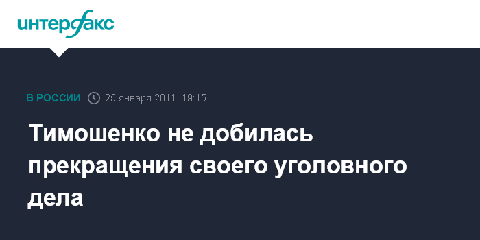 Киев. 25 января. INTERFAX.RU - Экс-премьер Украины, лидер партии "Батькивщина" Юлия Тимошенко заявила, что Генеральная прокуратура отказала в удовлетворении ее ходатайства о прекращении уголовного дела.