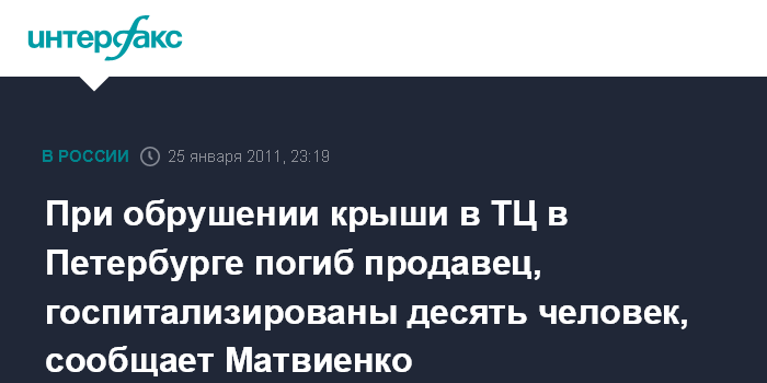 Санкт-Петербург. 25 января. ИНТЕРФАКС СЕВЕРО-ЗАПАД - Обрушение кровли в торговом центре в Петербурге произошло во время очистки от снега, погиб продавец, 10 человек травмированы, сообщила журналистам прибывшая на место происшествия губернатор города Валентина Матвиенко.