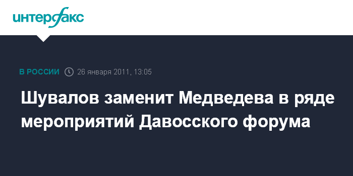 Горки. 26 января. INTERFAX.RU - Первый вице-премьер РФ Игорь Шувалов проведет мероприятия Давосского экономического форума, в которых из-за сокращения своей программы в связи с трагическими событиями в России не примет участие президент РФ Дмитрий Медведев, сообщила пресс-секретарь главы государства Наталья Тимакова.