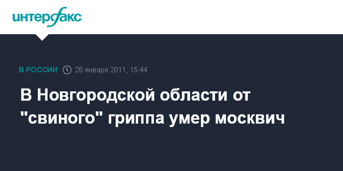 "Есть и первые жертвы эпидемии. На днях в одной из новгородских больниц от двусторонней застойной пневмонии, вызванной вирусом высокопатогенного гриппа А (H1N1) скончался 51-летний житель Москвы", - сказал вице-губернатор.