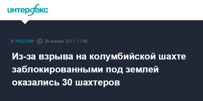 Богота. 26 января. INTERFAX.RU - Тридцать шахтеров оказались заблокированными в среду из-за взрыва на угольной шахте на севере колумбийского департамента Сантандер, сообщает колумбийская радиосеть"Караколь".
