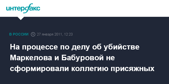 Москва. 27 января. INTERFAX.RU - Мосгорсуд отложил до середины февраля отбор коллегии присяжных по делу об убийстве адвоката Станислава Маркелова и журналистки Анастасии Бабуровой.