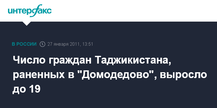 Душанбе. 27 января. INTERFAX.RU - Количество пострадавших граждан Таджикистана при взрыве в московском аэропорту Домодедово увеличилось с 16 до 19 человек, сообщил в четверг "Интерфаксу" глава оперативного штаба по оказанию помощи соотечественникам посольства республики в Москве Турабек Назаров.