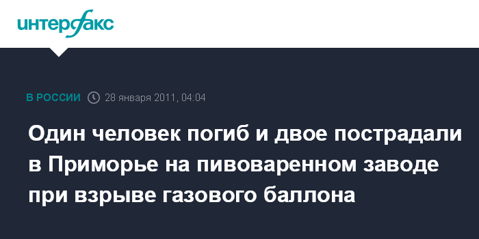 Владивосток. 28 января. ИНТЕРФАКС-ДАЛЬНИЙ ВОСТОК - На одном из предприятий по производству пива в приморском городе Дальнегорске в четверг взорвался баллон с углекислым газом, в результате чего один рабочий погиб, еще двое получили ранения.